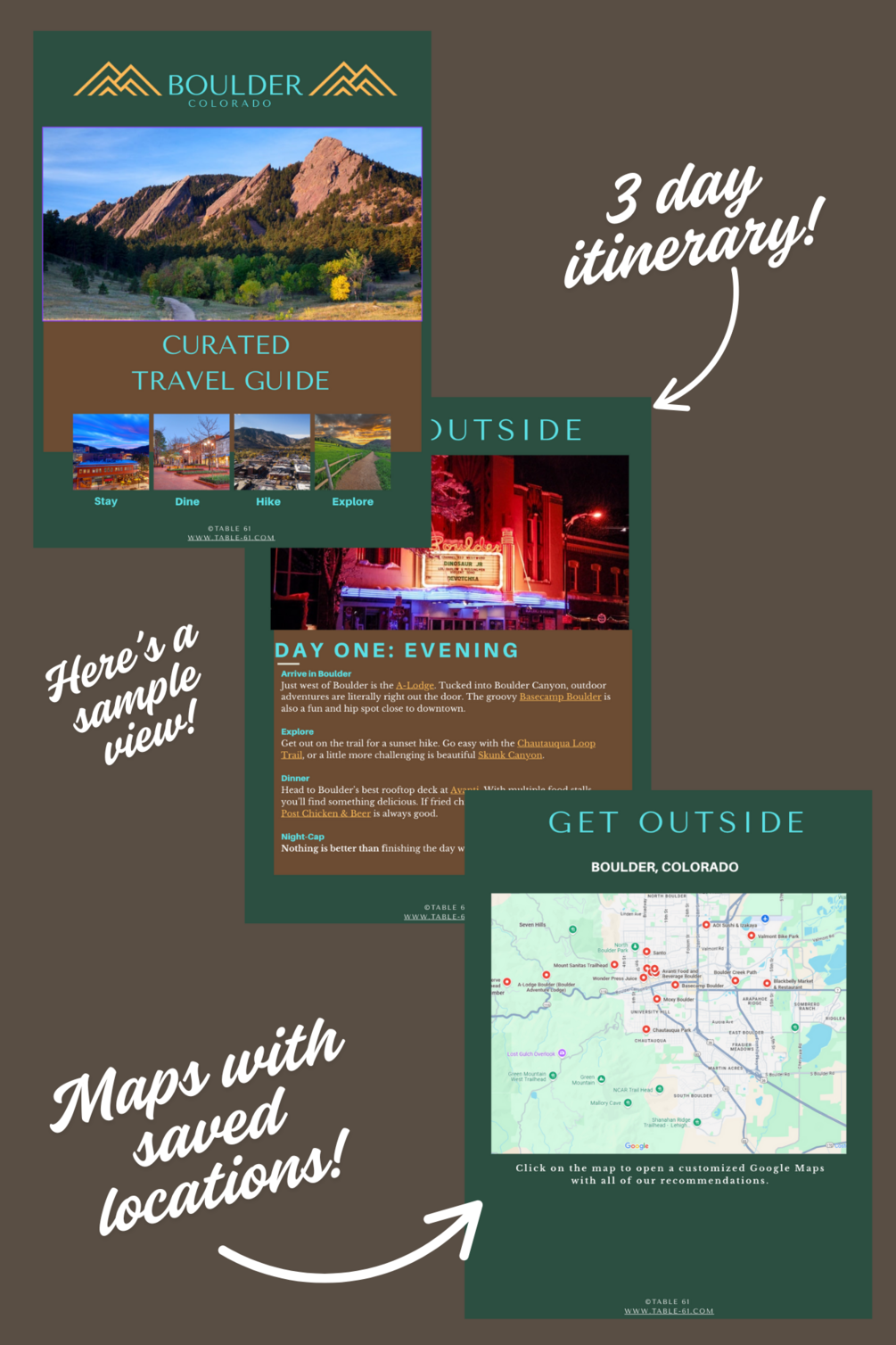 This download includes a 7 page PDF (with clickable links and map) with a 3 day guide to Boulder, Colorado. We include where to stay, where to eat, what to do, and where to explore.